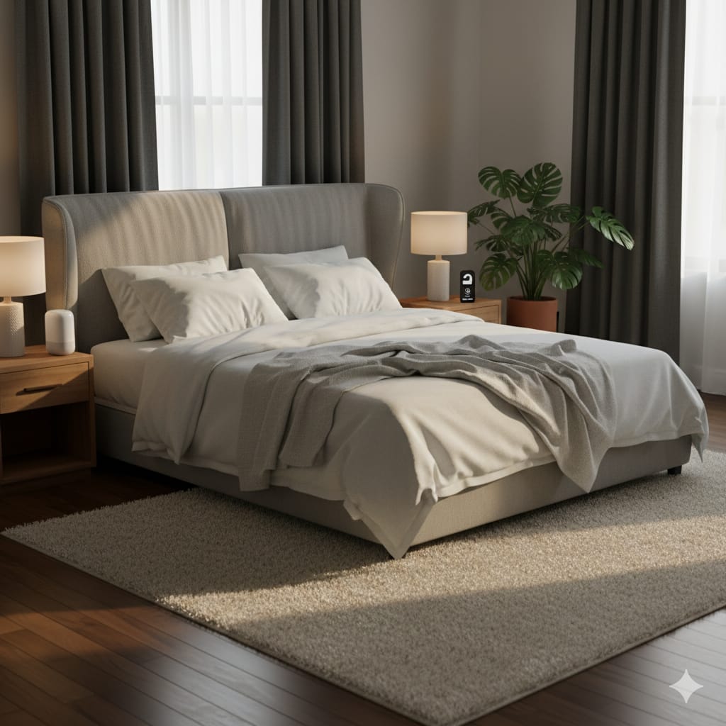 5. Redam Gema dengan Tekstil Permukaan keras seperti lantai kayu, dinding kosong, dan jendela besar dapat memantulkan suara, menciptakan gema yang membuat ruangan terasa “berisik”. Solusinya adalah menambahkan tekstil lembut untuk menyerap suara. Letakkan karpet tebal di lantai, gunakan tirai kain yang berat (selain blackout), dan pertimbangkan headboard tempat tidur yang dilapisi kain (upholstered) untuk meredam suara secara signifikan.